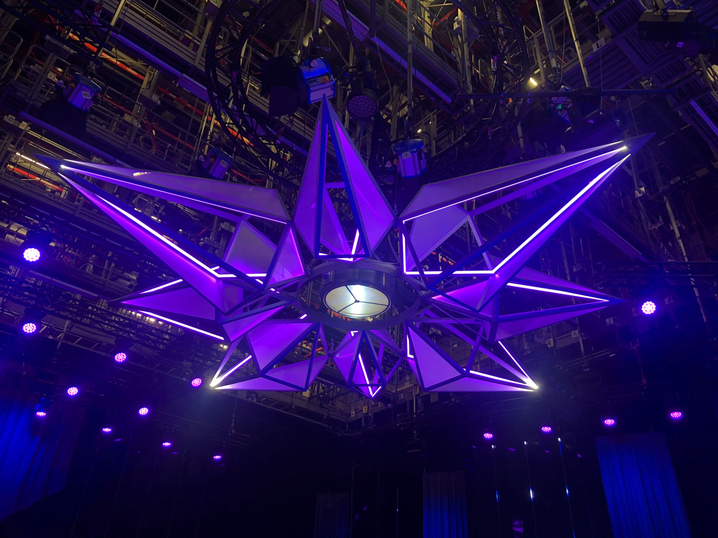 Examples of the design process and final elements of the chandelier, jury podium and talent area.
